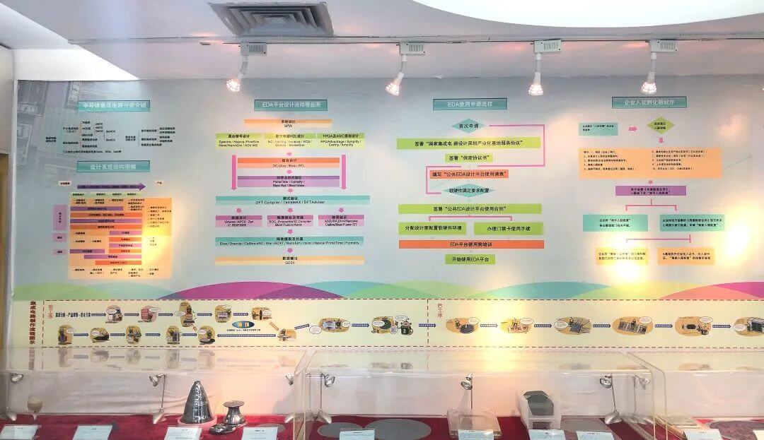 展厅里面对应的是实物从“ 石英砂--多晶硅--单晶硅棒--单晶硅片(粗)--单晶硅抛光片--光掩膜版(MASK)-- 晶圆 -- 多项目晶圆(MPW) -- 中测探针卡 --芯片分检完成,并通过框架、PCB板、引线到多种封装形式的IC,最后到集成电路应用板卡整体流程。